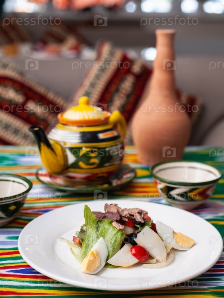 Салат с тунцом. Салат с яйцами, зеленью, луком, помидорами черри и тунцом. Азиатский стиль