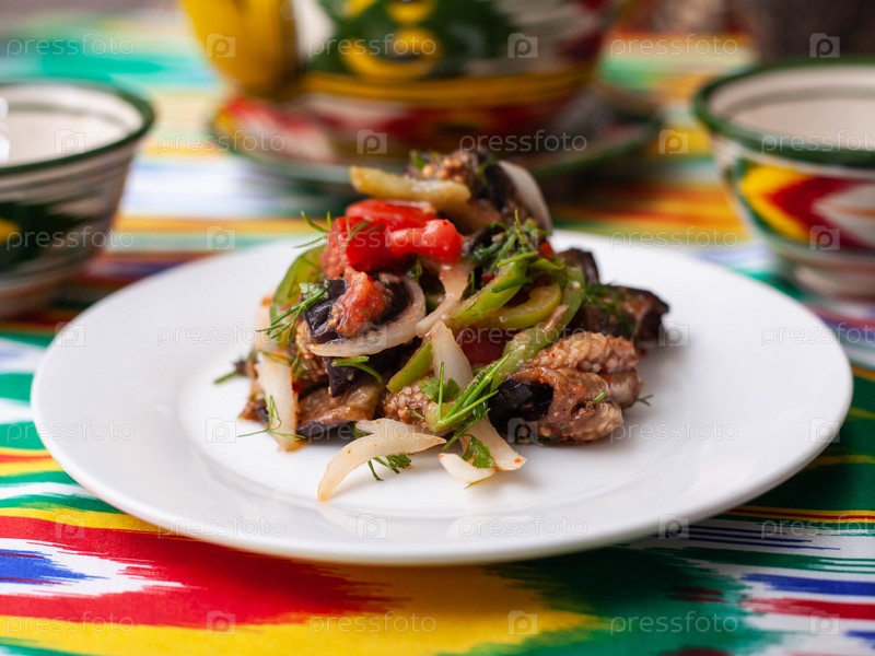 Теплый салат из зеленого и красного перца, мяса, баклажанов, лука и помидоров в азиатском стиле