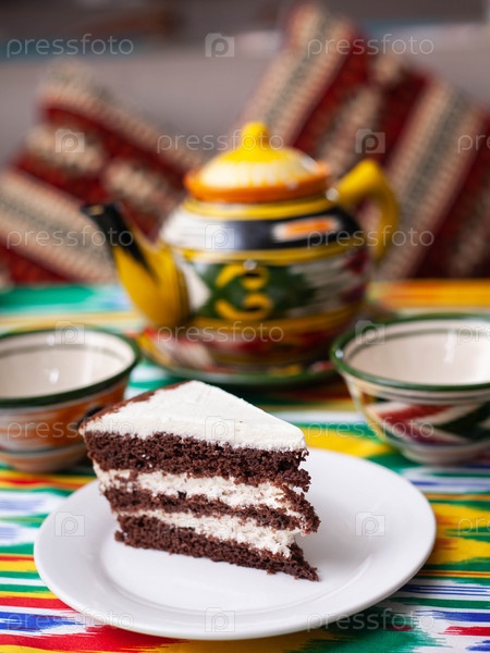 Десертный шоколадный торт с кремом из белого масла в восточном стиле на крыше с чайником и чашкой чая