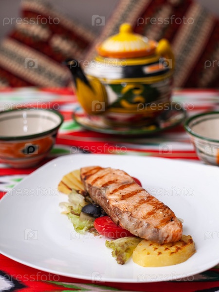 Стейк лосося на подушке из тушеных овощей. Азиатский стиль