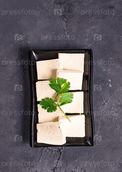 Ломтики тофу с петрушкой на черной тарелке