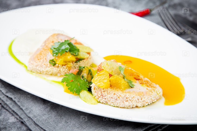 Рыба с мандаринами, петрушкой и кунжутом, вид сбоку