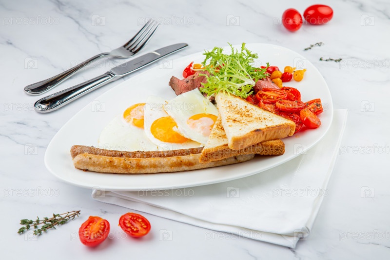 Яичница с овощами, помидорами черри, хлебом, зеленью и сосисками на белой тарелке, вид сбоку