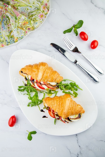 Круассаны с сыром, овощами, помидорами черри и зеленью, вид сверху