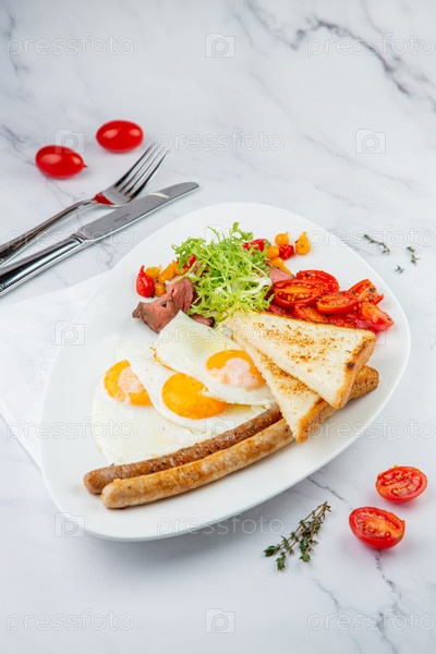 Яичница с овощами, помидорами черри, хлебом, зеленью и сосисками на белой тарелке, вид сбоку