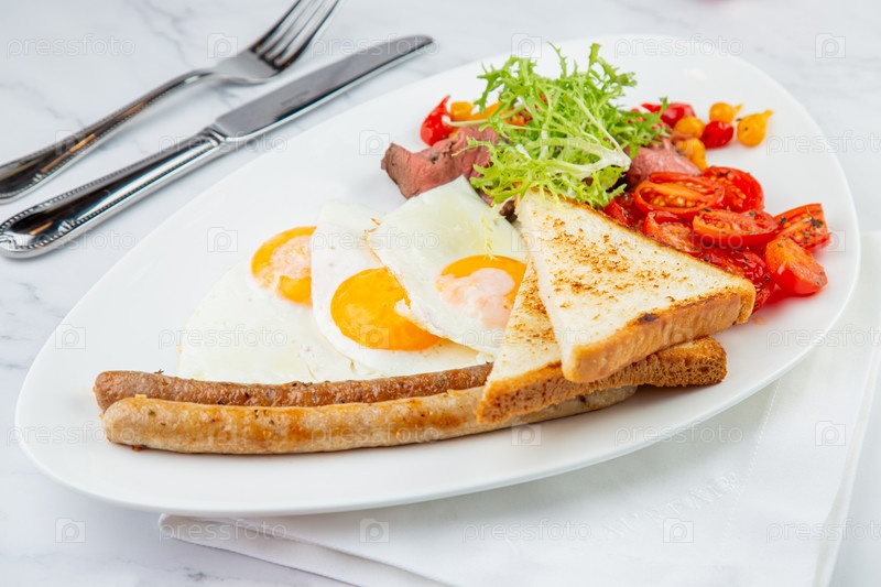 Яичница с овощами, помидорами черри, хлебом, зеленью и сосисками на белой тарелке, вид сбоку