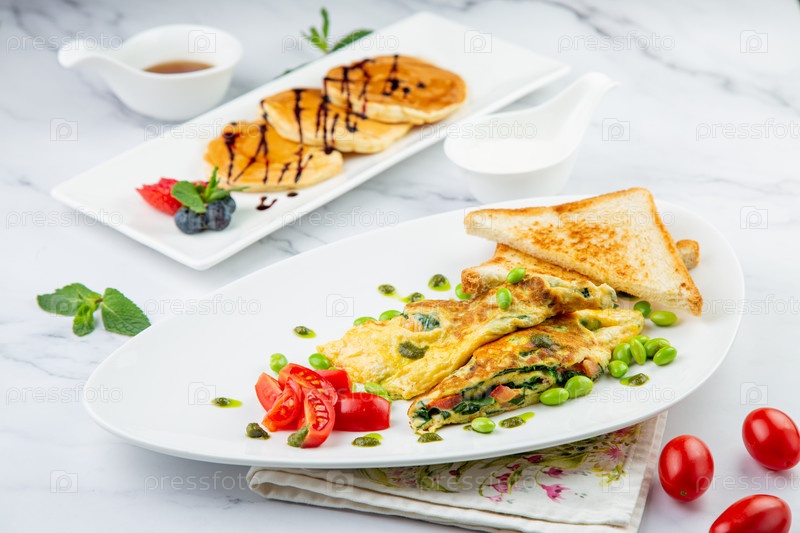 Завтрак из яиц и овощей с помидорами черри и ломтиками хлеба в белой тарелке с видом на блины
