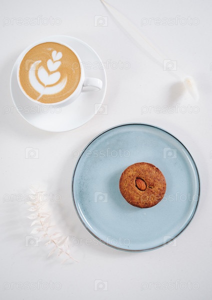 Печенье с орехами внутри и кофе с узором на круглой тарелке, вид сверху