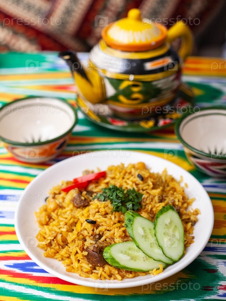 Национальный узбекский плов с мясом на столе в узбекском стиле. на столе с чайником и чашкой чая