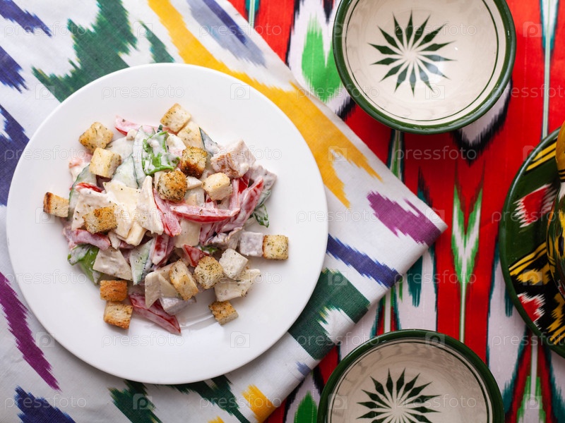 Салат Малибу с крабовыми палочками и гренками, сыром фета и овощами. Азиатский стиль