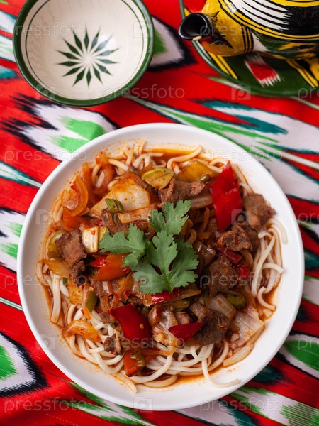 Восточное блюдо лагман – это домашняя лапша, обжаренная с мясом, овощами и зеленью. Восточная кухня
