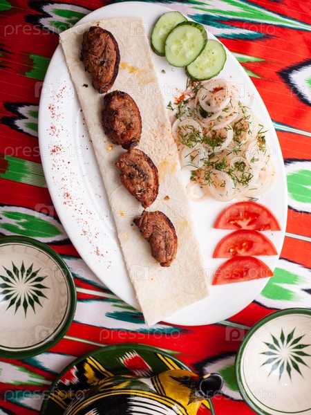 Куриный шашлык - куриная грудка, приготовленная на углях. Подается с овощами, маринованным луком, лавашем и восточным соусом