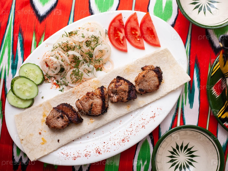 Куриный шашлык - куриная грудка, приготовленная на углях. Подается с овощами, маринованным луком, лавашем и восточным соусом