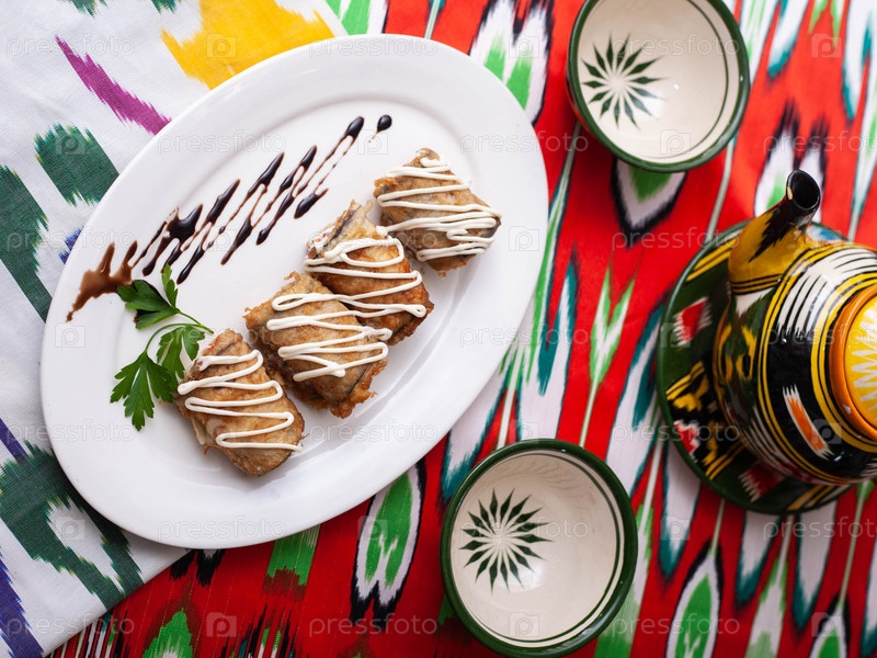Жареные рулетики из баклажанов в панировке с начинкой из мяса и овощей. Азиатский стиль