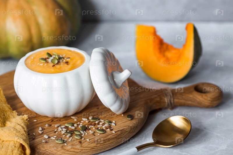 Сезонная осенняя еда. Традиционный тыквенный крем-суп в миске в форме тыквы и свежая тыква на сером мраморном фоне