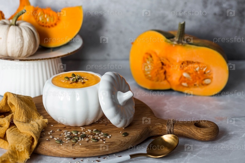 Сезонная осенняя еда. Традиционный тыквенный крем-суп в миске в форме тыквы и свежая тыква на сером мраморном фоне
