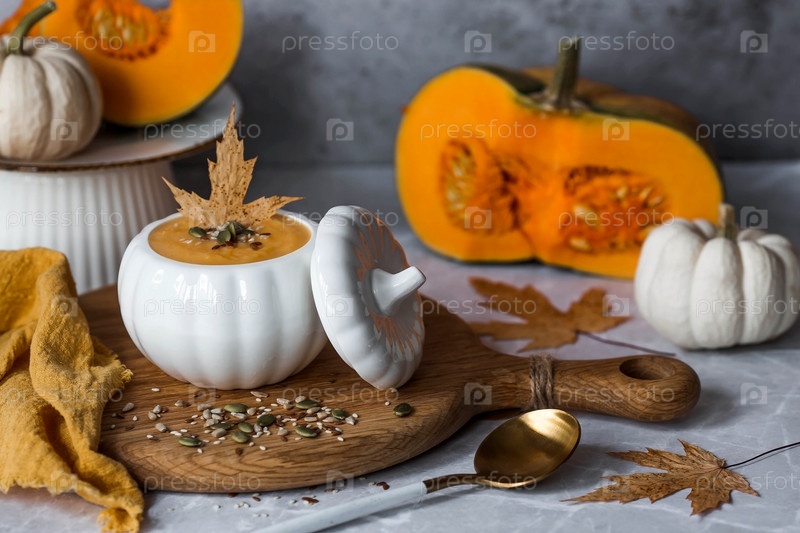 Сезонная осенняя еда. Традиционный тыквенный крем-суп в миске в форме тыквы и свежая тыква на сером мраморном фоне