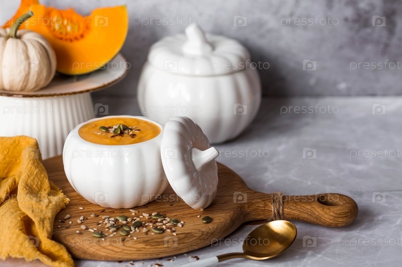 Сезонная осенняя еда. Традиционный тыквенный крем-суп в миске в форме тыквы и свежая тыква на сером мраморном фоне