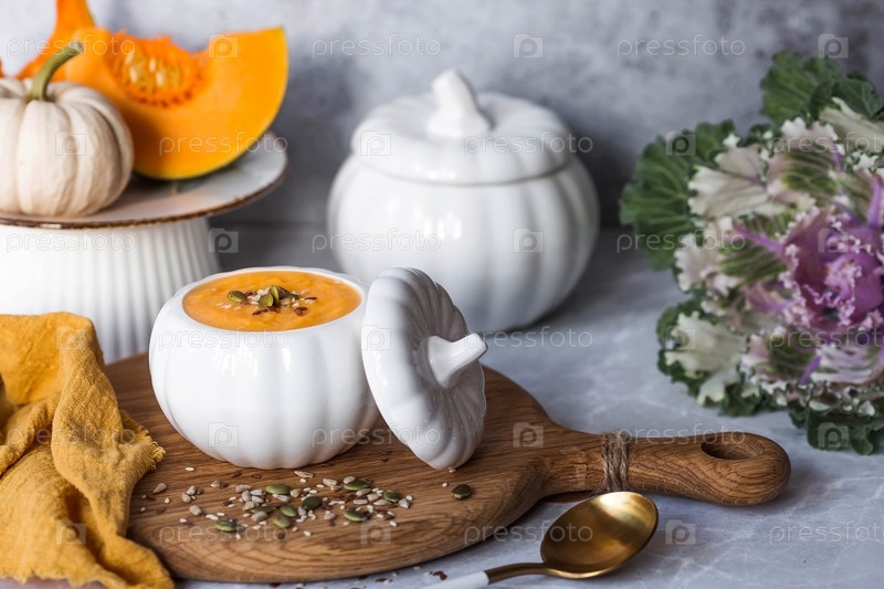 Сезонная осенняя еда. Традиционный тыквенный крем-суп в миске в форме тыквы и свежая тыква на сером мраморном фоне