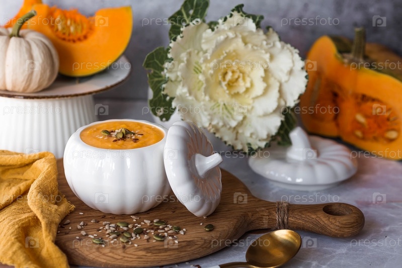 Сезонная осенняя еда. Традиционный тыквенный крем-суп в миске в форме тыквы и свежая тыква на сером мраморном фоне