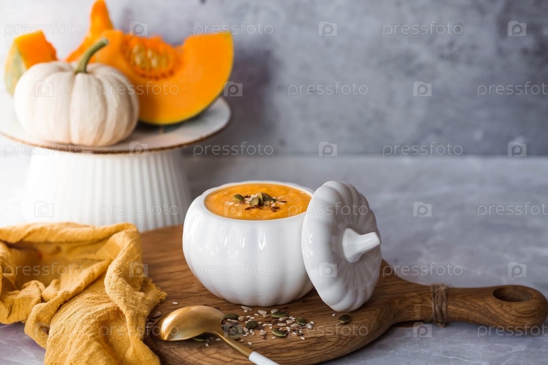 Сезонная осенняя еда. Традиционный тыквенный крем-суп в миске в форме тыквы и свежая тыква на сером мраморном фоне
