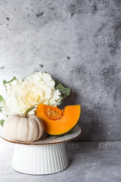 Сезонная осенняя еда. Свежие тыквы и декоративная капуста на фоне серого мрамора