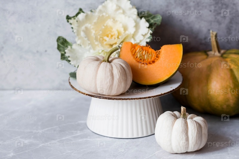 Сезонная осенняя еда. Свежие тыквы и декоративная капуста на фоне серого мрамора