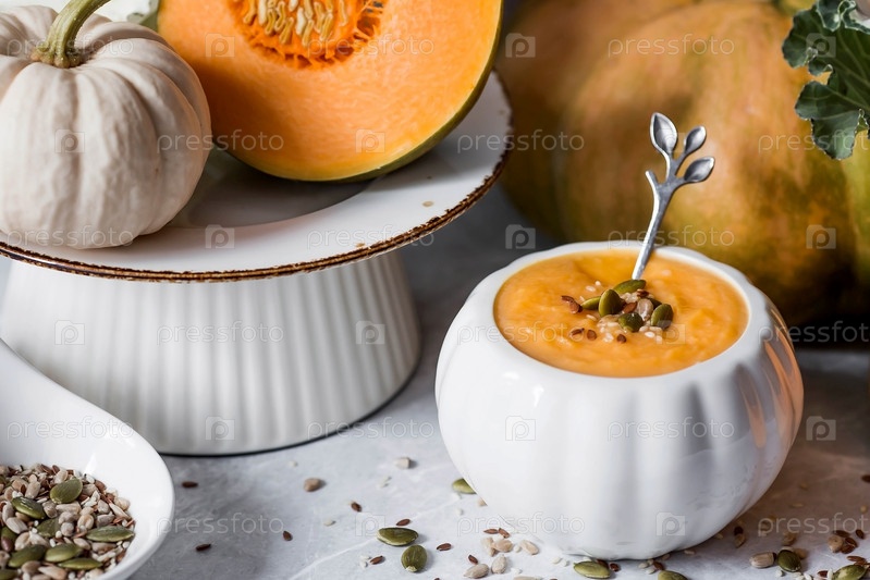 Сезонная осенняя еда. Традиционный тыквенный крем-суп в миске в форме тыквы и свежая тыква на сером мраморном фоне