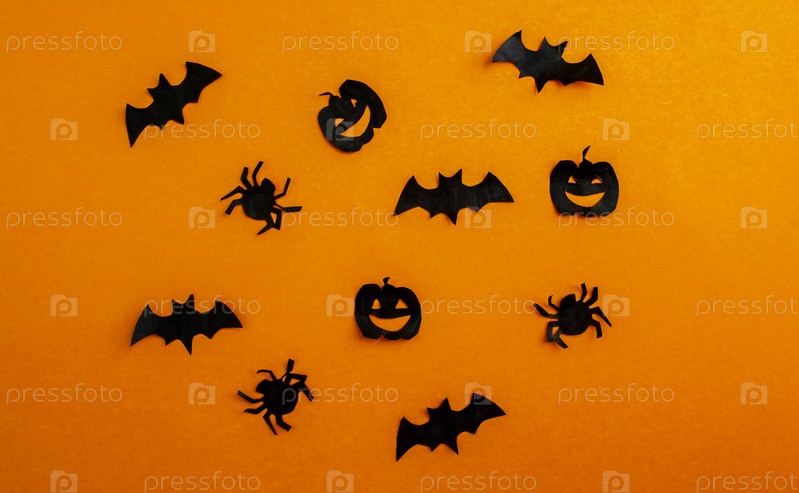Хэллоуин фон, бумажные черные летучие мыши, тыквы и пауки на оранжевом фоне