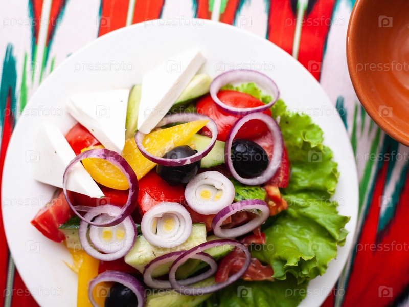 Овощная нарезка по-грузински - помидоры, огурцы, зелень, перец болгарский, сыр, лук. Азиатский стиль