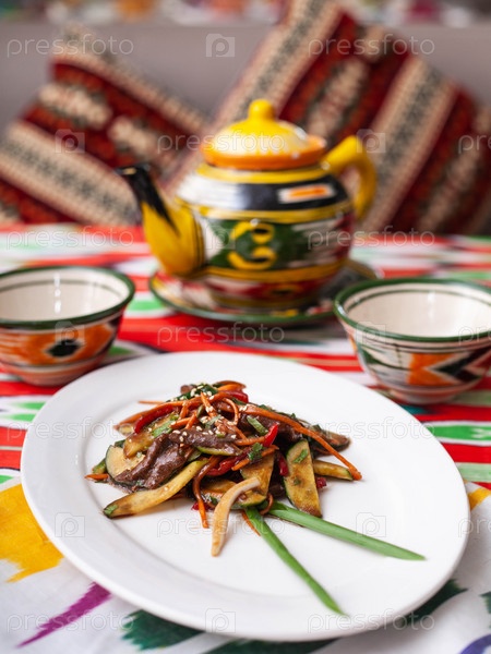 Восточный теплый салат. Обжаренные кусочки говядины, маркови и огурцов в соусе и кунжуте. Азиатский стиль