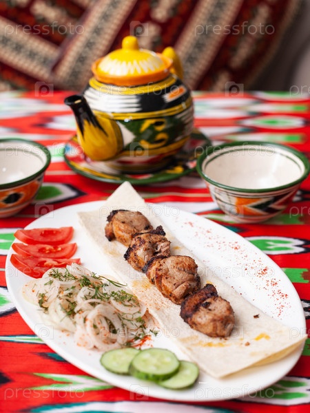 Куриный шашлык - куриная грудка, приготовленная на углях. Подается с овощами, маринованным луком, лавашем и восточным соусом