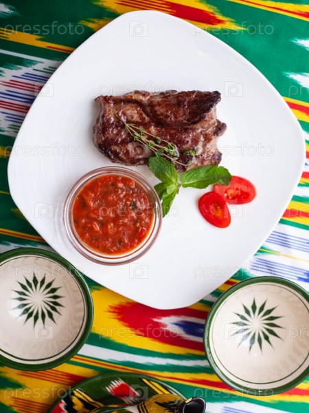 Стейк из говядины с томатным соусом, помидорами и зеленью в восточном стиле на столе с чайником и чашкой чая