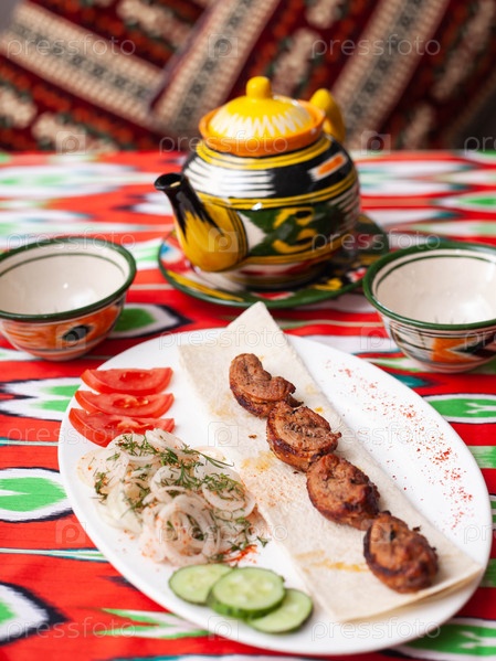 Куриный шашлык - куриная грудка, приготовленная на углях. Подается с овощами, маринованным луком, лавашем и восточным соусом