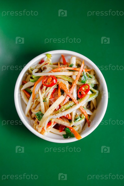Салат из китайской капусты с морковью в белой миске. Вид сверху. Китайская кухня, ингредиент для тушеного мяса