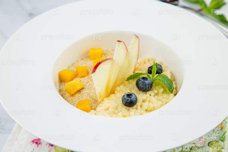 Каша с кусочками яблока, манго, ягод и мяты на белой тарелке, вид сбоку