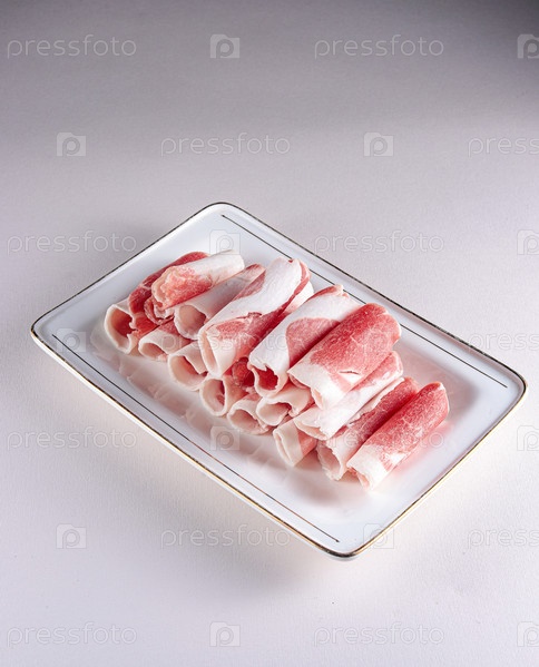 Свежие и эстетичные булочки с беконом на белой тарелке. Вид сверху. Китайская кухня, ингредиент для тушеного мяса