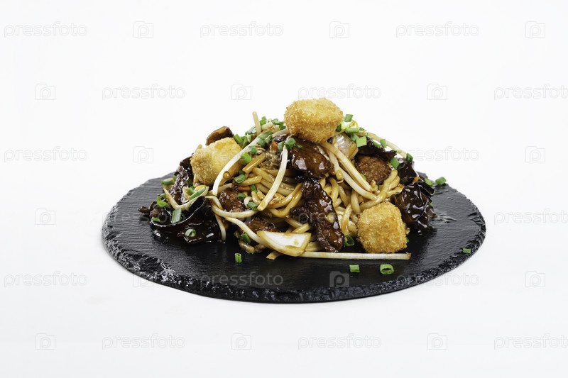 Яичная лапша с курицей в соусе терияки на черной тарелке