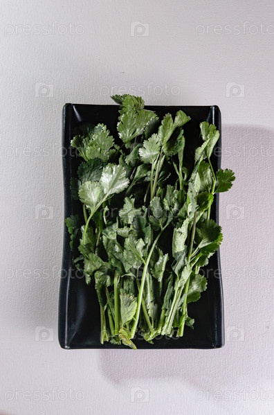 Зеленая петрушка на черной тарелке. Вид сверху. Китайская кухня, ингредиент для тушеного мяса