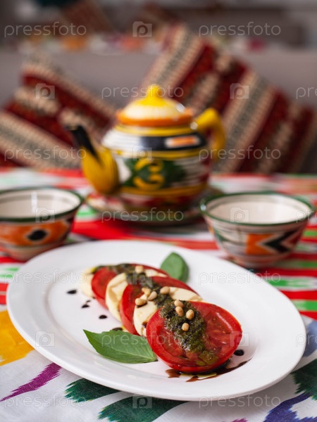 Итальянский салат капрезе с помидорами, сыром мацарелла и бальзамическим соусом. Азиатский стиль