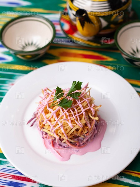Салат «Гнездо глухаря» из свеклы, пирожкового картофеля, маркови и зелени, заправленный майонезом. Азиатский стиль