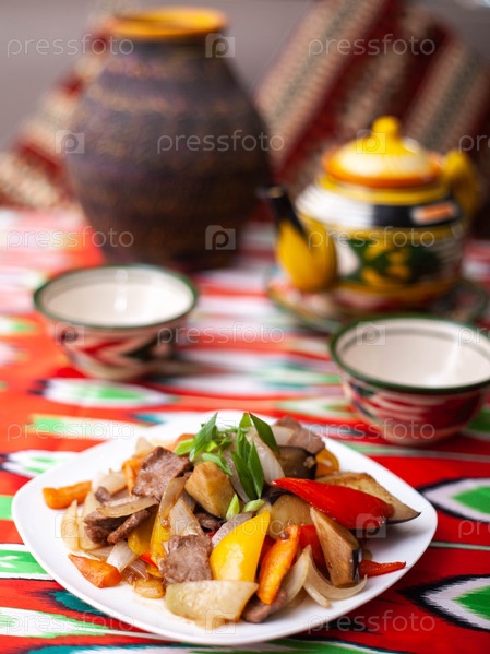 Жареная говядина в масле с картофелем, луком, болгарским перцем по уйгурскому рецепту