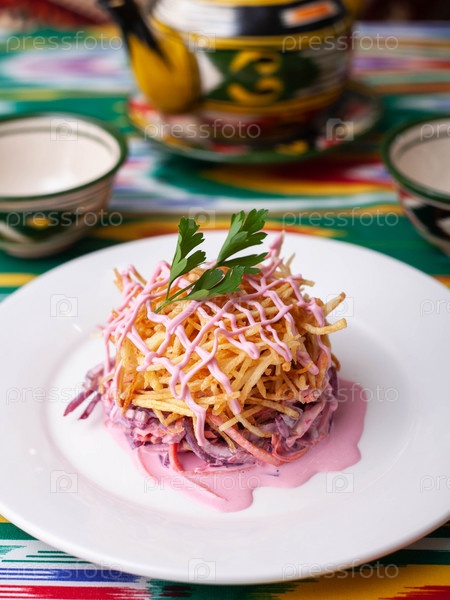 Салат «Гнездо глухаря» из свеклы, пирожкового картофеля, маркови и зелени, заправленный майонезом. Азиатский стиль