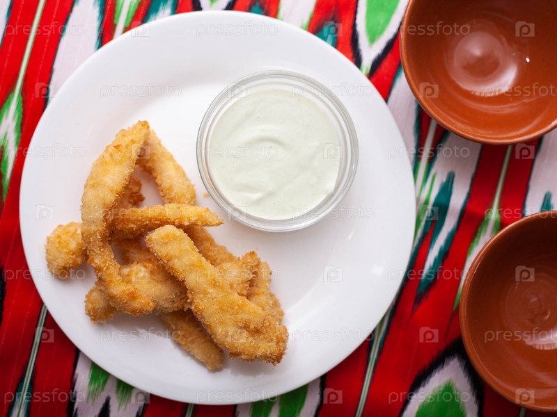 Куриные наггетсы и жареная курица в панировке со сливочным соусом. Азиатский стиль
