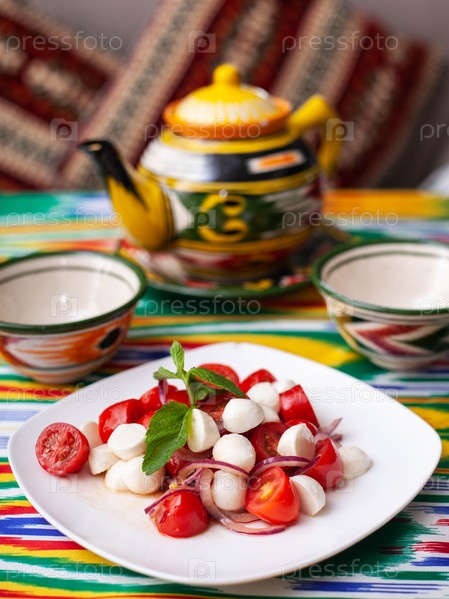 Салат капрезе с помидорами мацарелла и зеленью в восточном стиле на столе с чайником и чашкой чая