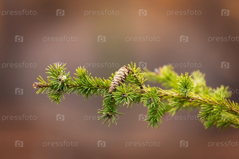 Еловая ветка с конусом с малой глубиной резкости, на размытом фоне