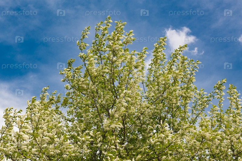 Цветущая черемуха на фоне ярко-голубого неба с белыми облаками