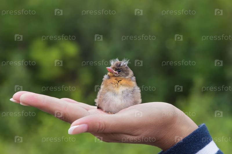 Птенец зяблика сидит на женской ладони. Крупный план с размытым фоном