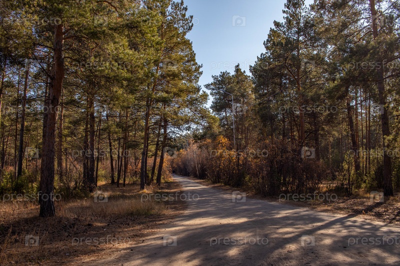 Осенний лесной пейзаж с деревьями и дорогой