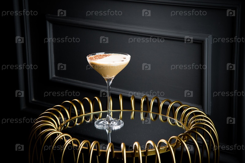 Ледяной латте с пеной в бокале для мартини на темном фоне